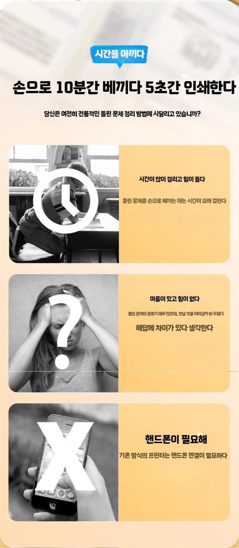 안녕하세요. 오늘은 다용도로 사용가능한 휴대용 스캔 프린터를 소개하려고 합니다. 학습 시에는 오답노트로 사용이 가능합니다