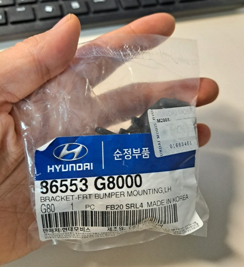 운전석 앞쪽 상단 왼쪽 브라켓과 범퍼의 고정핀을 현대부품점에서 구매했습니다