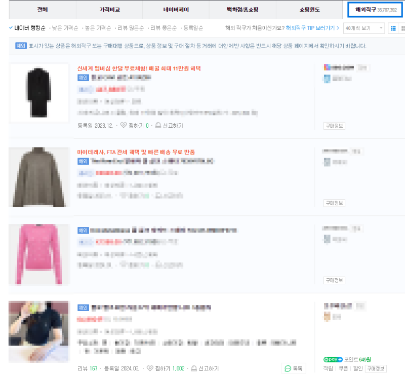 N사 쇼핑 해외직구 탭 상위 1페이지에 판매 건 수 1건 이상(최근 6개월 이내)의 자료들을 정리해 보았습니다