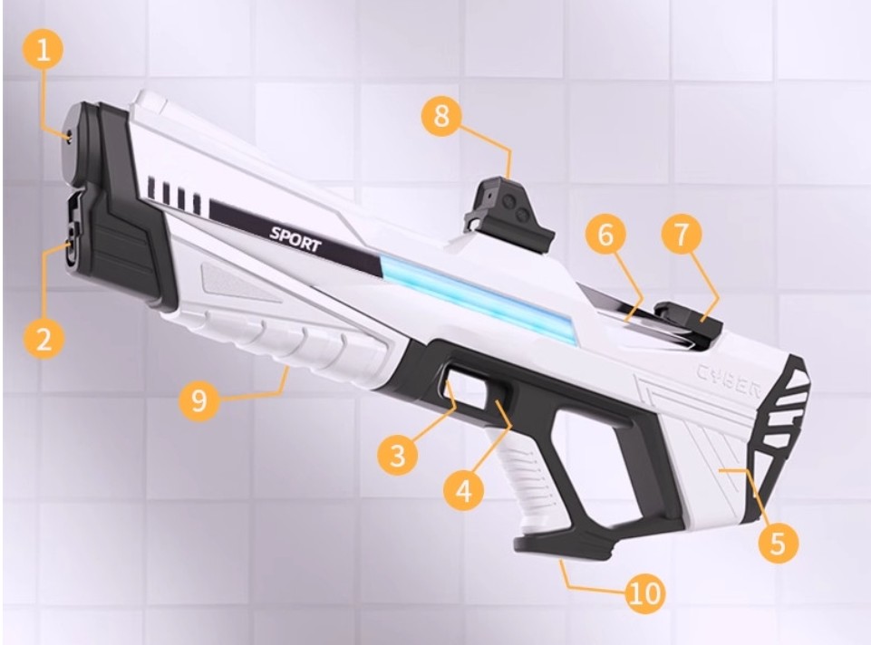 1.분수대 2.흡수구 3.흡수방아쇠 4.방아쇠 5.배터리창 6.저장창 7.확장창 8.조준기 9.배수구 10.배수구