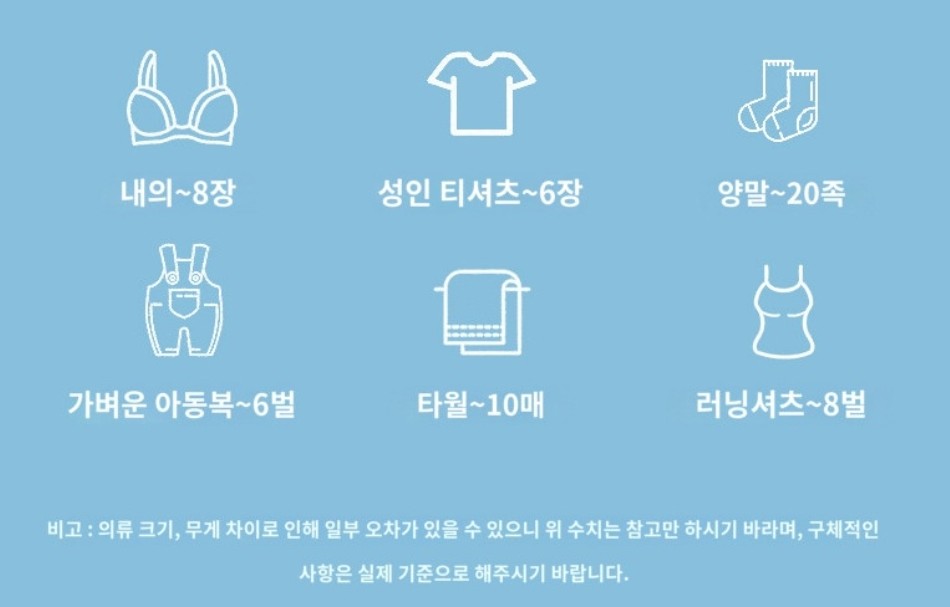 한번에 처리할수 있는 빨래의 양은 아래와 같습니다