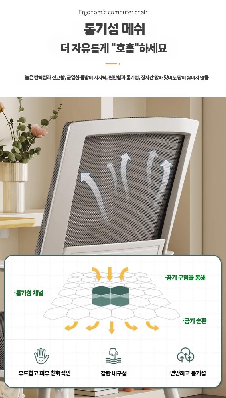장기간 앉아서 업무 및 공부를 하여도 편안함을 느끼실 수 있고, 공기순환을 통해 시원함을 느끼 실 수 있습니다