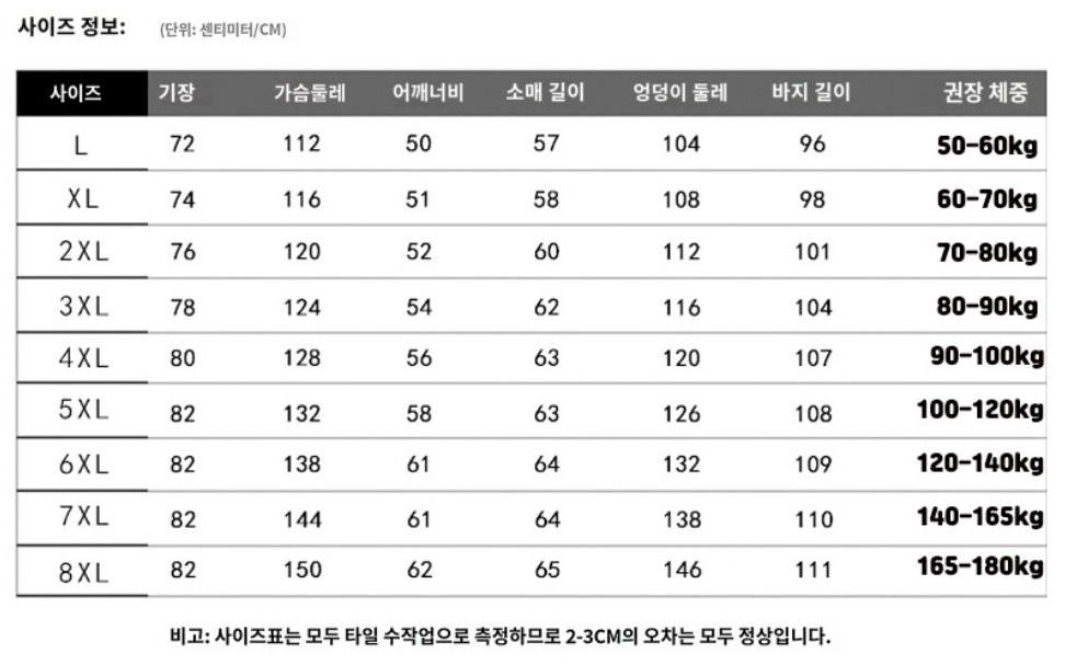레드, 스카이 블루, 그레이, 블루, 블랙의 다섯 가지 색상 옵션을 제공하며, 3XL부터 8XL까지 다양한 사이즈로 누구나 편안하게 착용할 수 있습니다