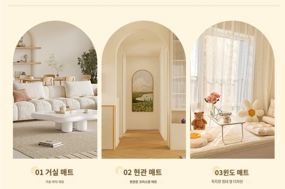 이 러그는 총 6가지 스타일로 구성되어 있으며, 크기는 120×200부터 200×350까지 다양하게 선택할 수 있어 거실, 현관, 윈도우 매트 등 다양한 공간에 맞춰 배치할 수 있습니다