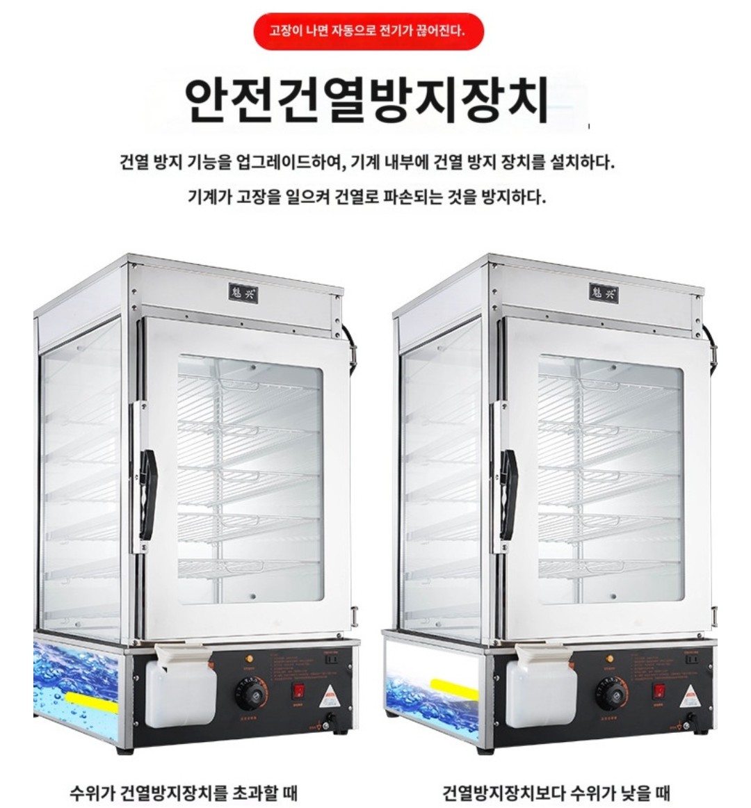 :수위가 건열 방지 장치보다 낮아질 경우, 기계가 자동으로 전원을 차단하여 안전성을 극대화합니다