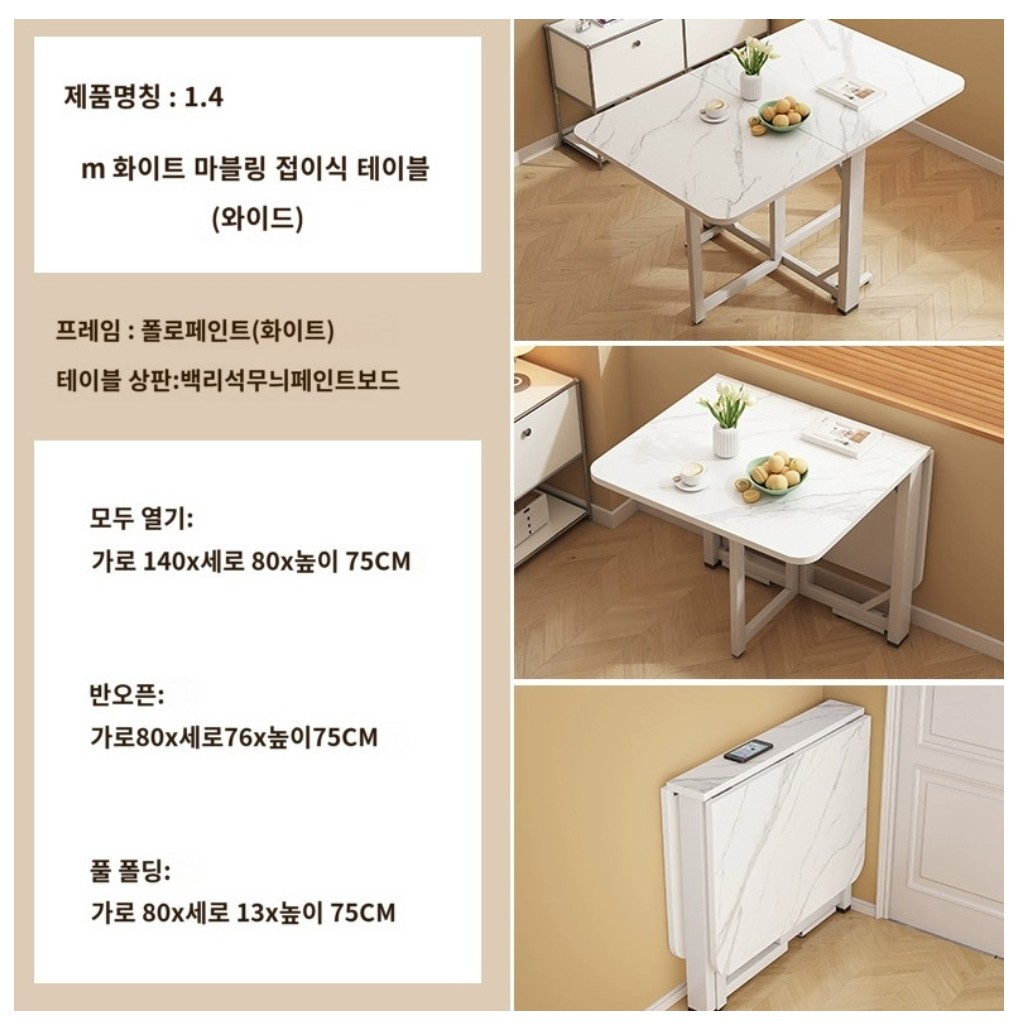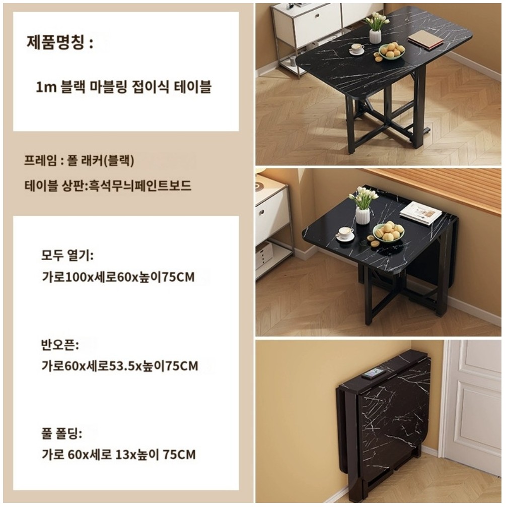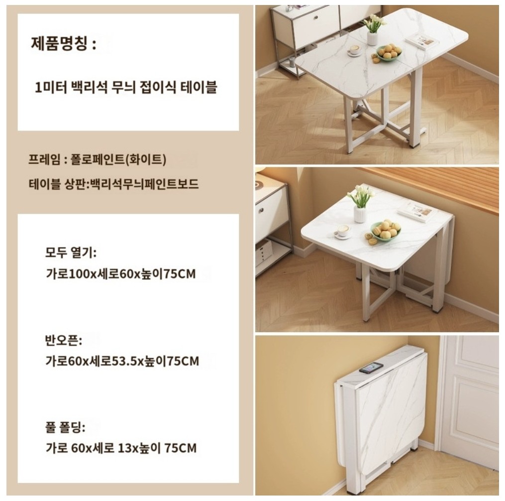 -가로 100cm 테이블 기준, 반으로 접었을 시 사이즈: 가로 60 × 세로 13 × 높이 75cm