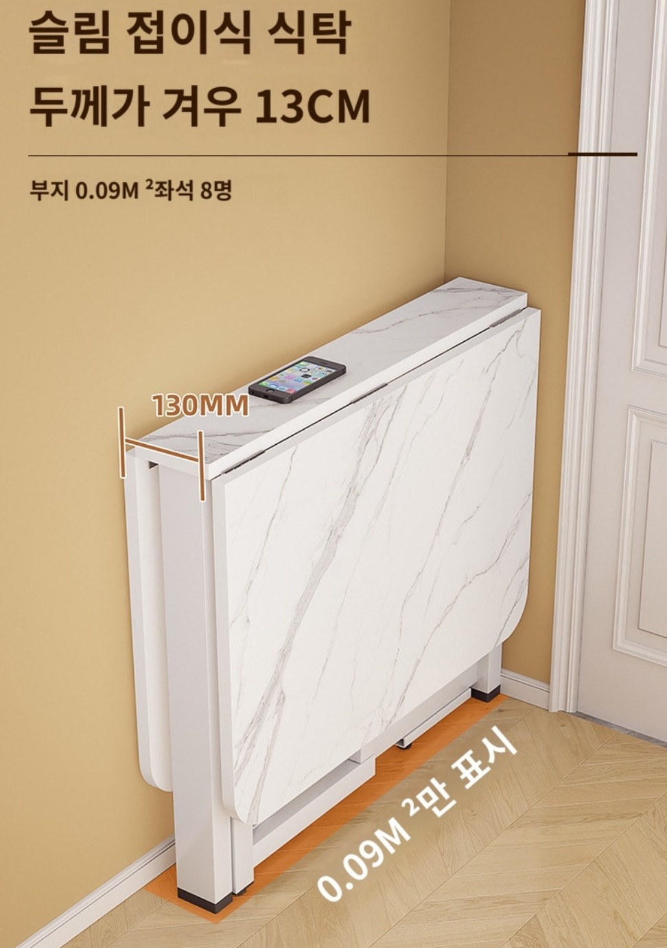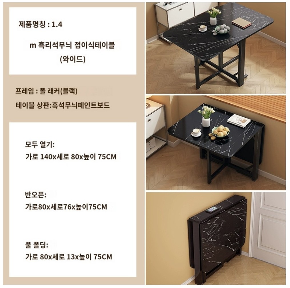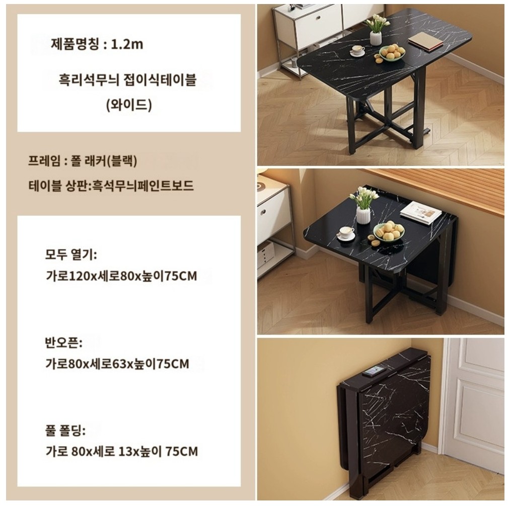 -가로 100cm 테이블 기준, 반으로 접었을 시 사이즈: 가로 60 × 세로 13 × 높이 75cm