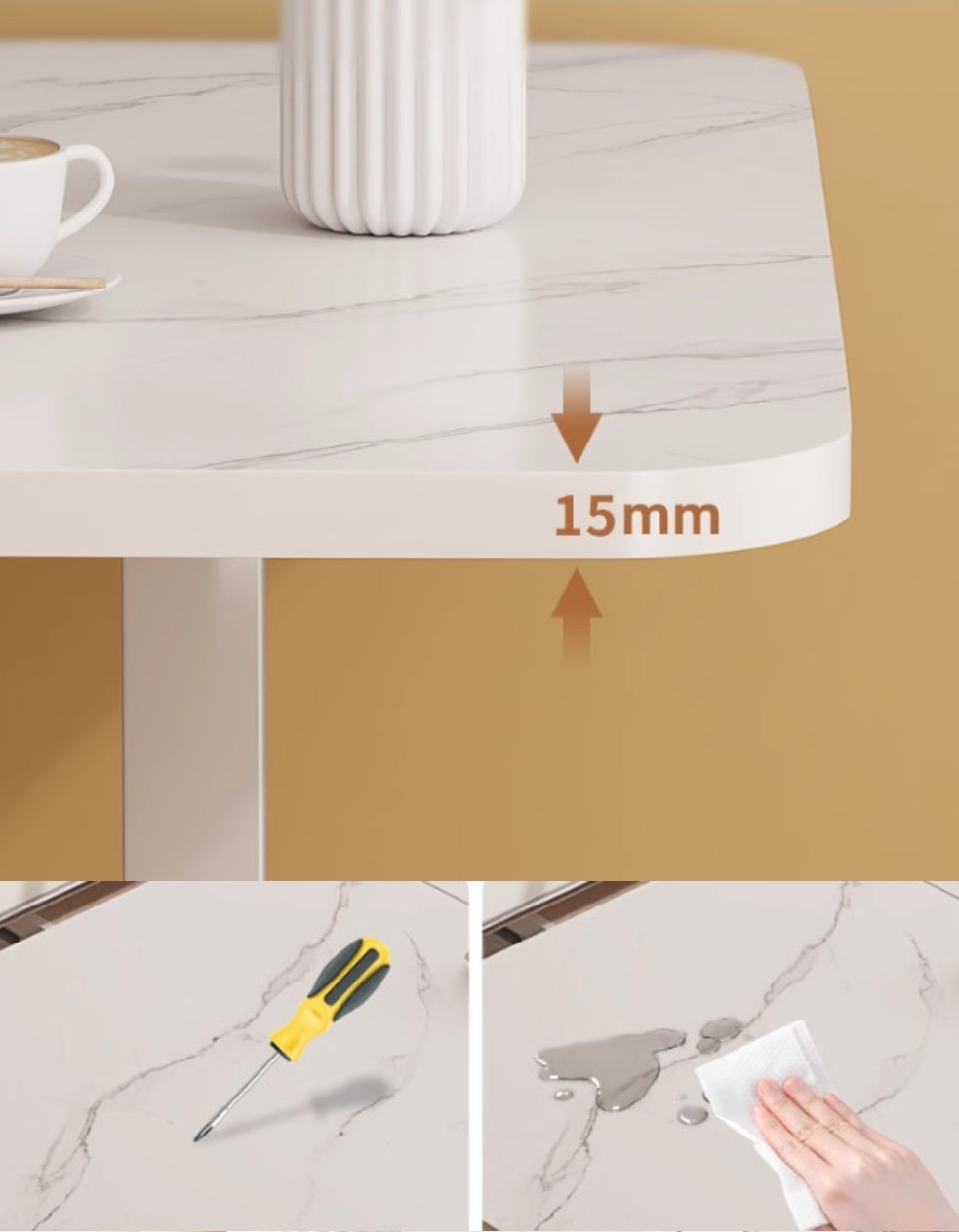 -15mm 도톰한 데스크탑, 내마모성이 뛰어나 긁힘 없이 오랫동안 사용 가능