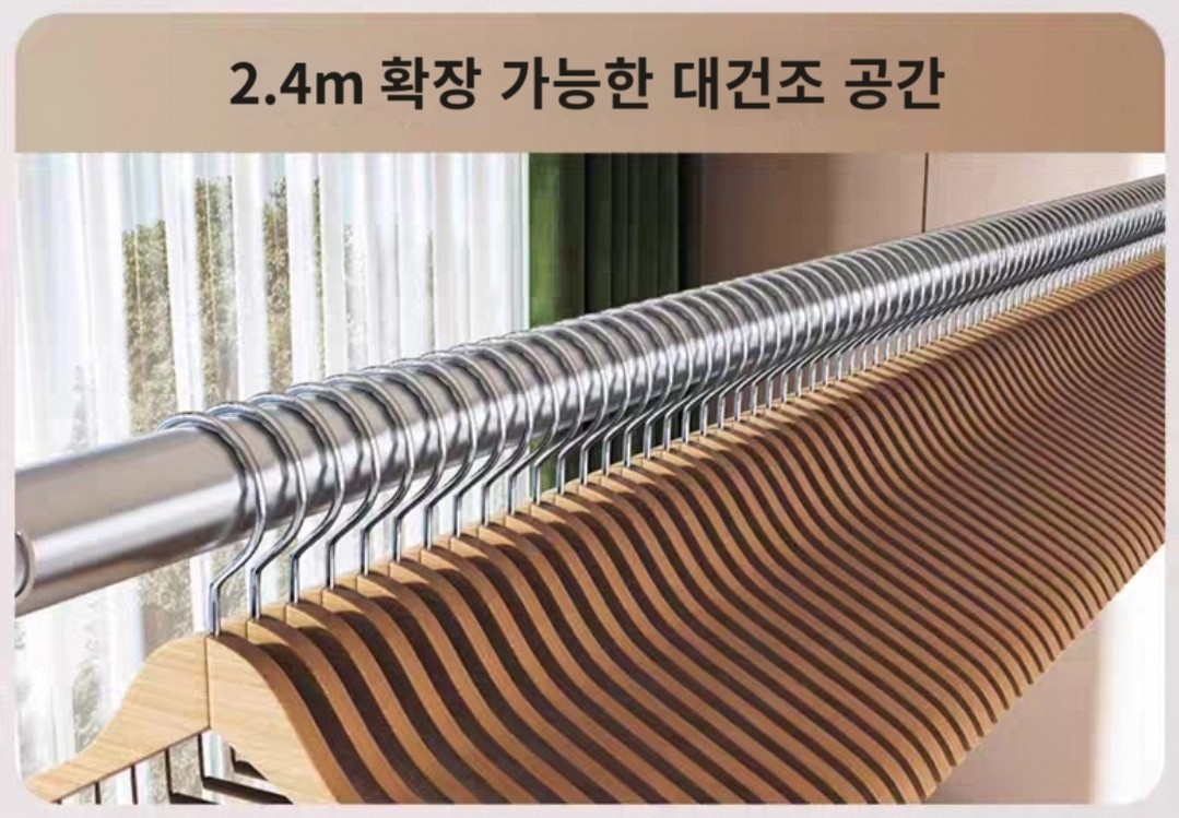 옵션은 총 3가지 길이로 구성되어 있어 1.6m / 2.0m / 2.4m까지 확장 가능하며, 걸이세트 20개 + 집게 12개를 추가로 드려 바로 설치 후 편리하게 사용할 수 있습니다