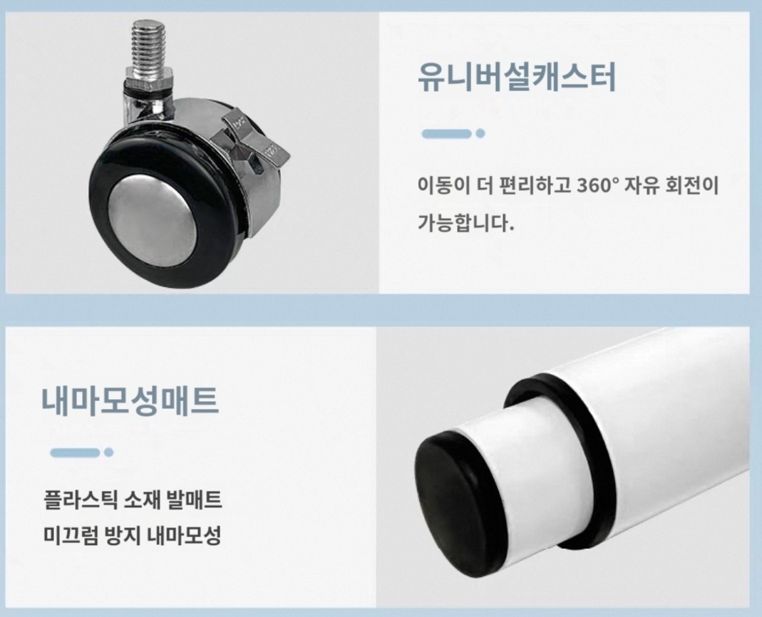 고강도 하중 보호 고무창이 함께 구성되어 있어 바닥을 긁지 않고, 충격도 흡수해주니 실내 어디에나 걱정 없이 사용 가능합니다