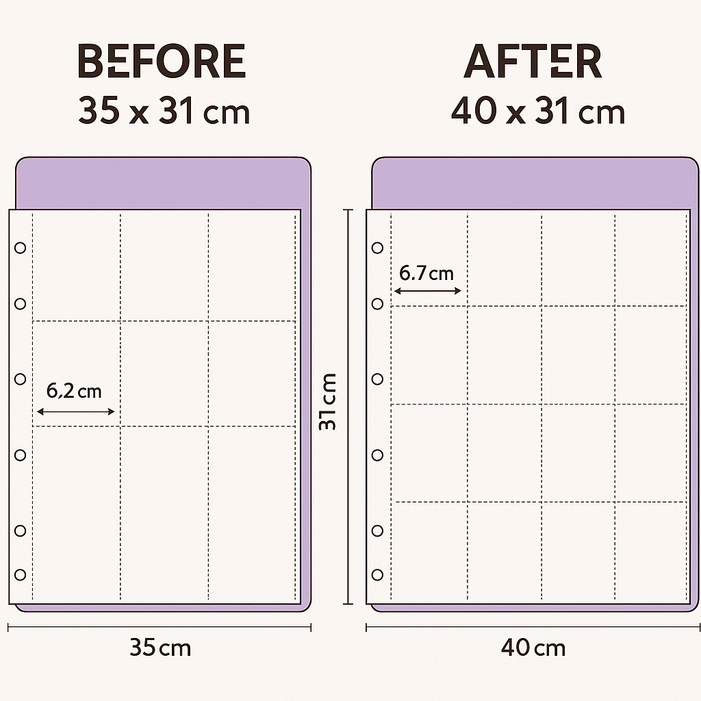 기존 포켓 사이즈는 6.2cm였지만, 이번 앨범은 6.7cm × 9.5cm로 가로폭이 더 넓어졌어요