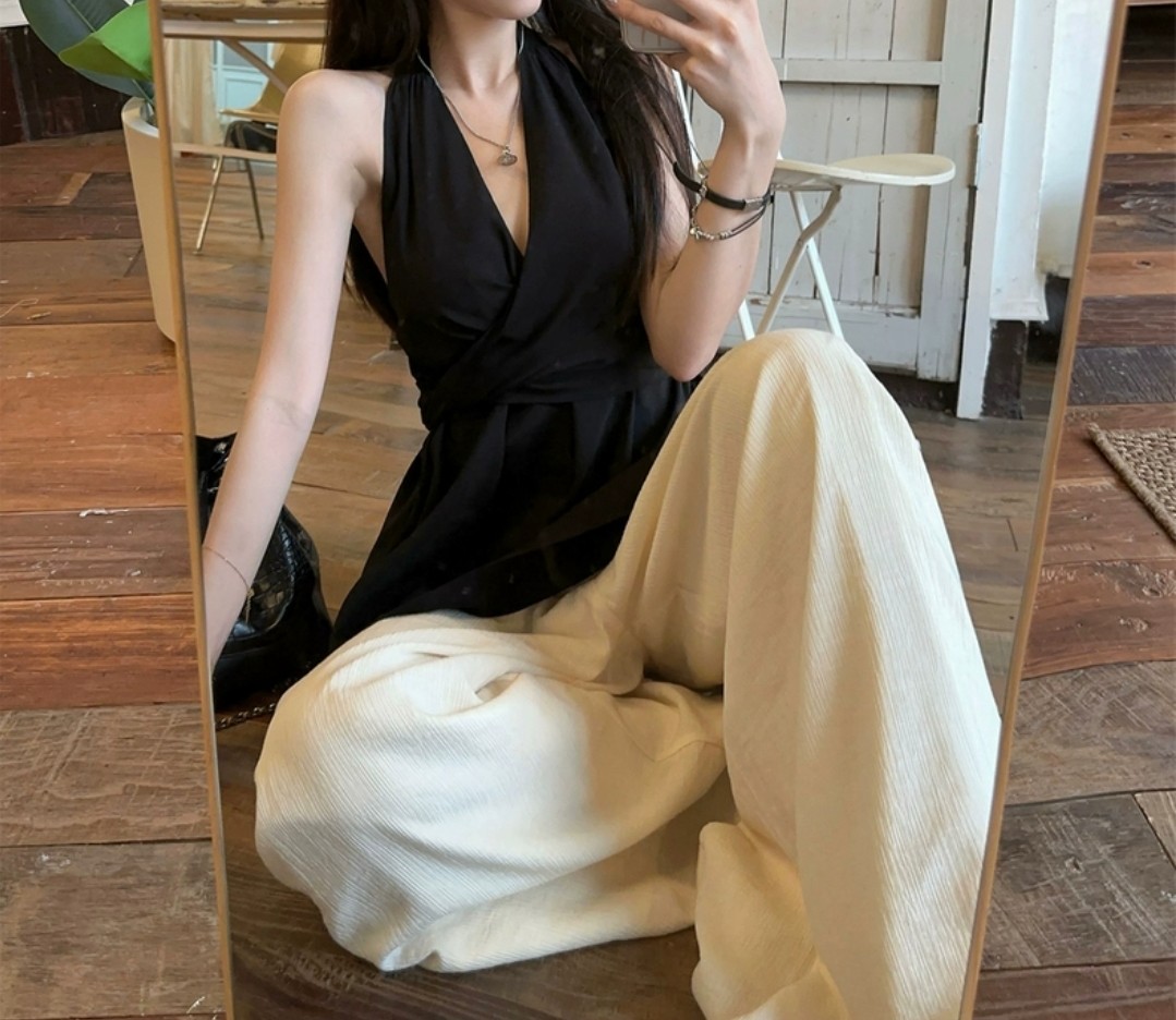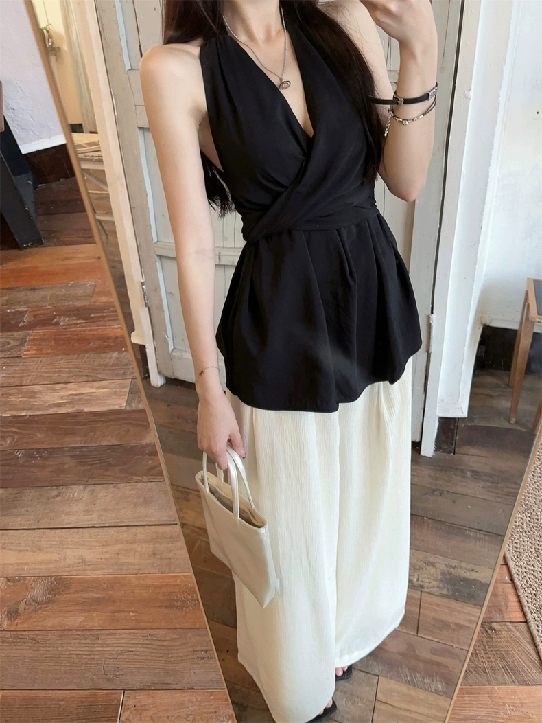 고급스러운 프렌치 감성의 홀터넥 크롭 나시와 하이웨스트 와이드 팬츠로 구성된 세트 아이템입니다