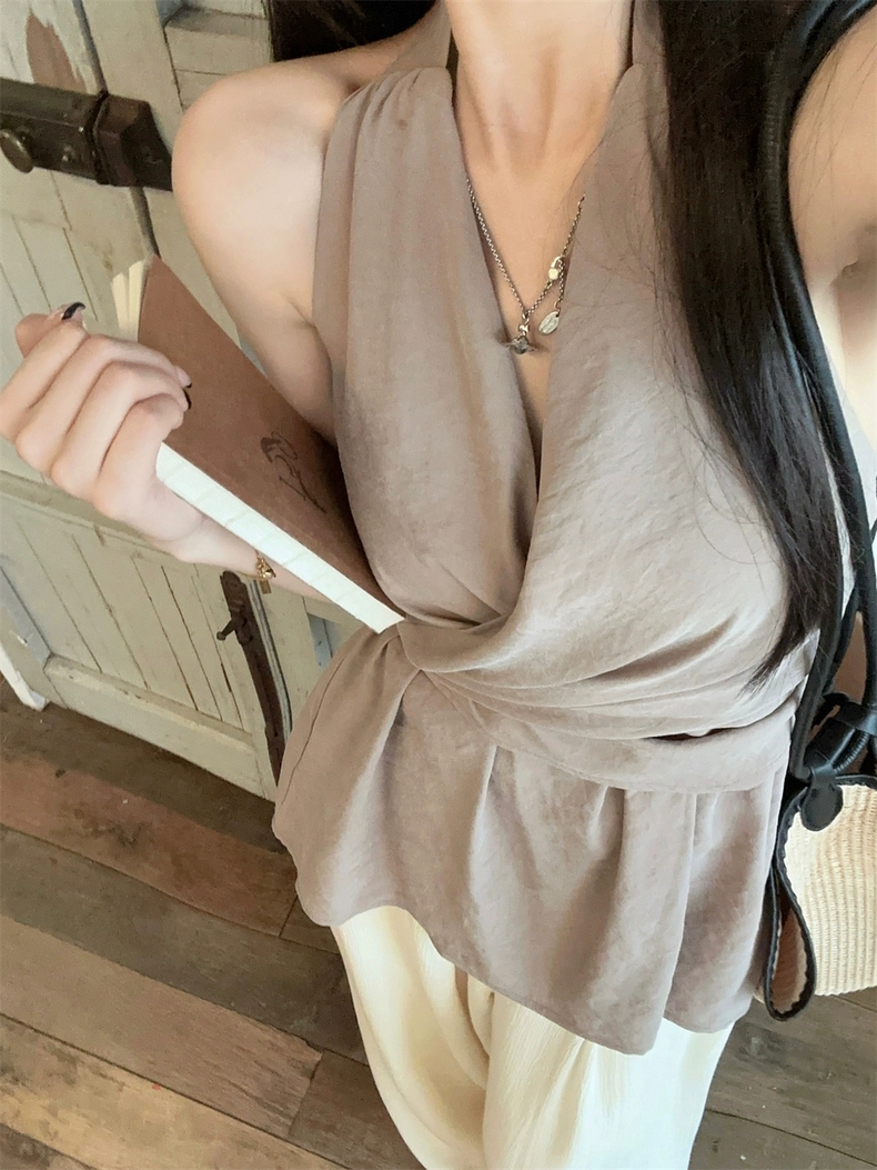 홀터넥 크롭탑: 바스트 라인을 자연스럽게 감싸주는 꼬임 디테일과 슬림핏으로, 여리여리한 실루엣 연출