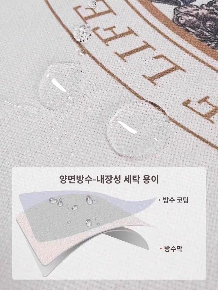 이중 방수 구조(방수 코팅층 + 방수 필름)로 물이나 기름이 흘러도 스며들지 않고 튕겨냅니다. 물이 닿아도 한 방울처럼 맺히는 모습, 사진에서 확인할 수 있어요