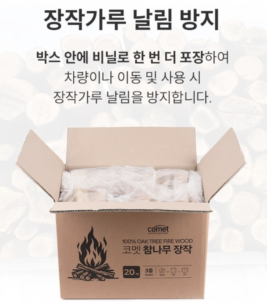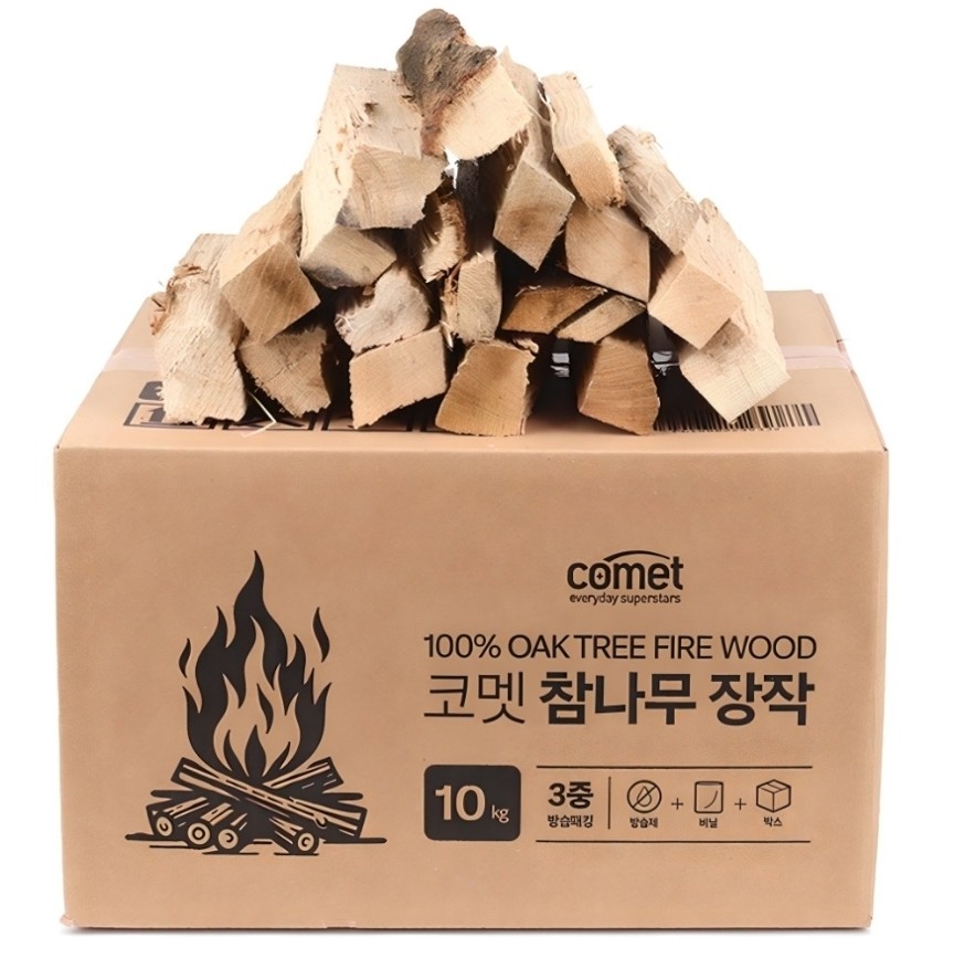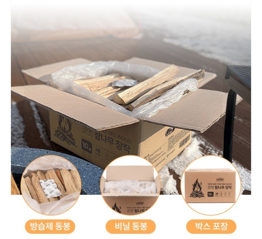 코멧 장작은 방습제 + 비닐 + 박스 3중 포장으로 배송됩니다. 습기를 차단하고 장작 가루 날림을 막아주니, 받았을 때 깔끔한 상태 그대로 사용할 수 있어요