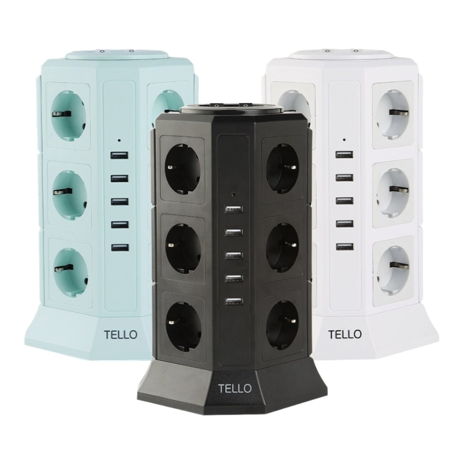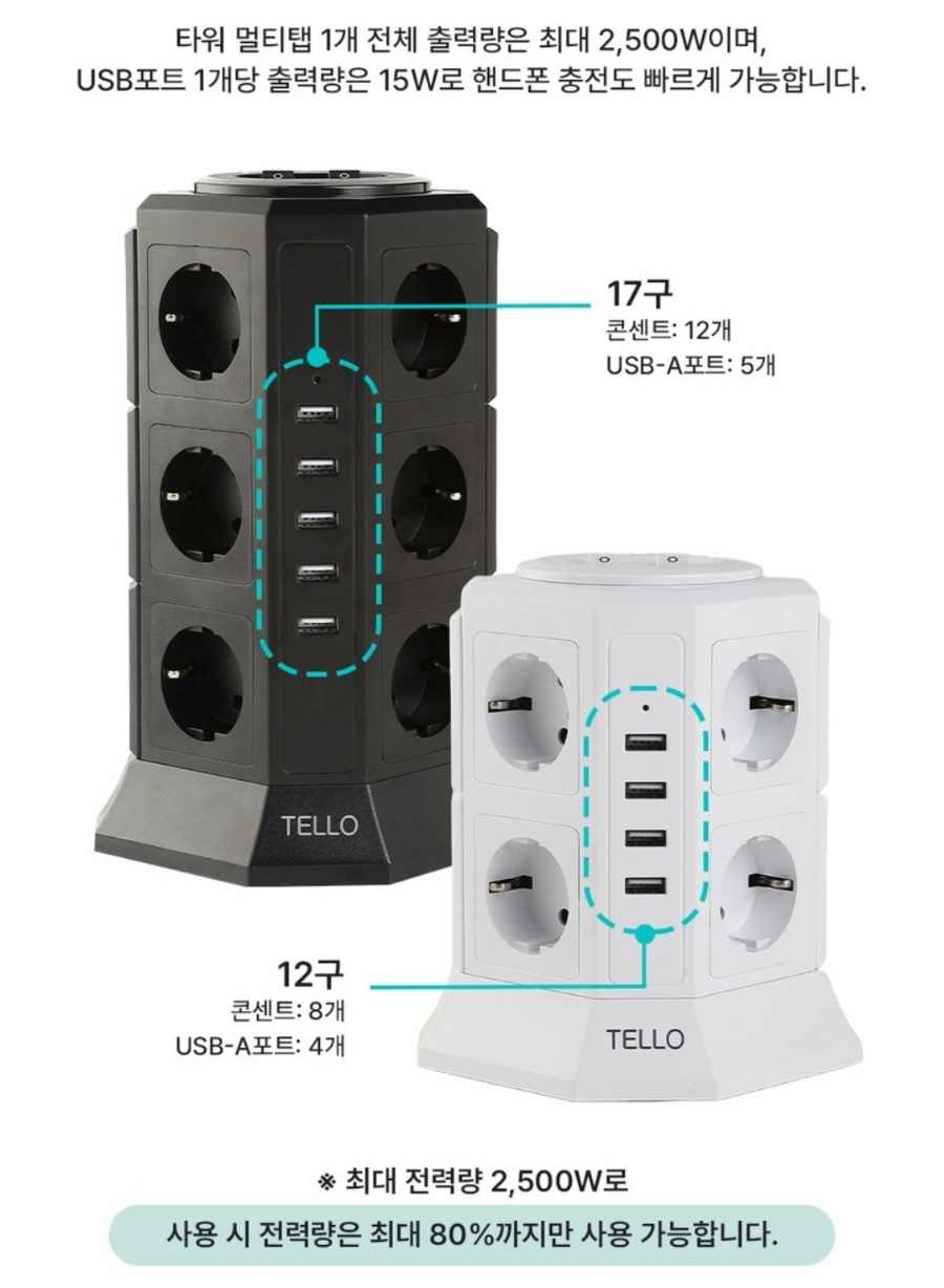 (베이직)텔로 과부하차단 USB 타워 멀티탭 서지 차단 17구 인테리어 사무실 책상 다용도 KC인증 예