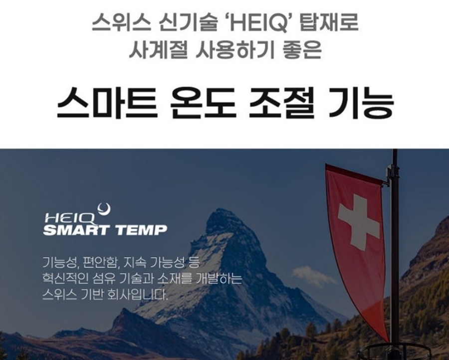 HeiQ 스마트 온도조절 기술 : 체온에 따라 쾌적함 유지 (더울 땐 시원하게, 추울 땐 따뜻하게)