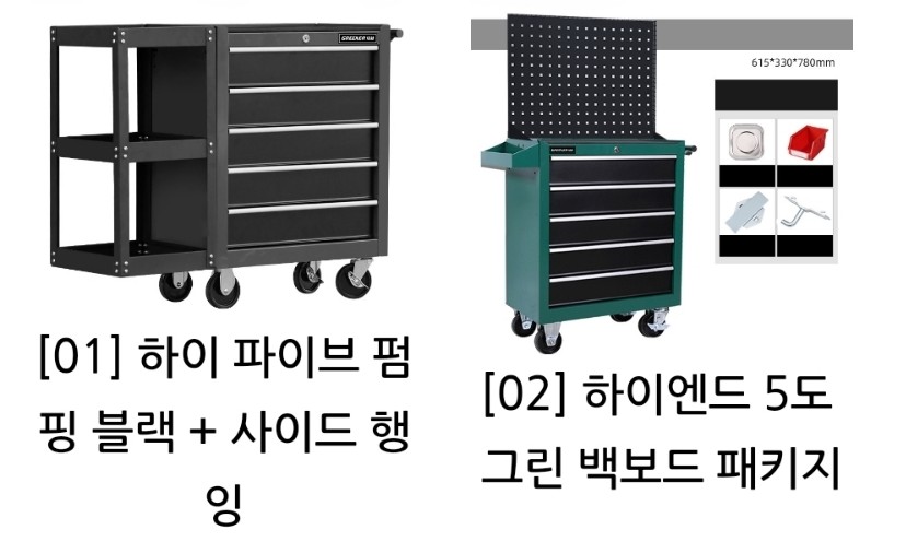 옵션은 공구 서랍장 모델과 백보드가 포함된 모델로 구성되어 있습니다